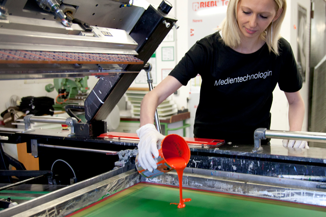 Die Medientechnologen Siebdruck erstellen Produkte in unterschiedlichen Formen und Materialien. Ob aus Papier, Glas oder Kunststoff, ob runder Kugelschreiber oder megagroßes Poster, lichtbeständige Farben und wetterfeste Materialien machen den Siebdruck überall einsatzfähig. Auch Fahrzeuge und City-Light-Poster werden in diesem Verfahren bedruckt.